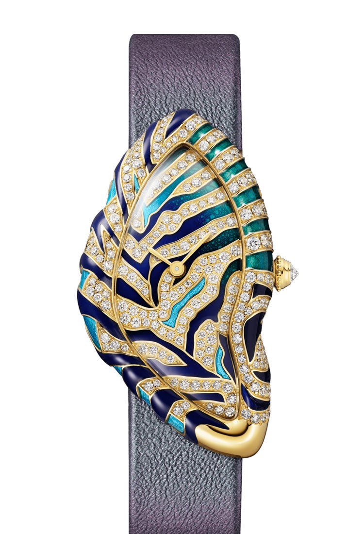 系列分别以Crash与Ronde Louis Cartier等作品为基础,并结合品牌擅长的动物主题,衍生出富有生命力的视觉印象。其中Crash Tigrée由金属雕刻、珐琅彩绘与珠宝镶嵌工艺等技法组成,卡地亚工艺师特别採用氧化鈷与氧化铜营造珐琅的蓝色渐变色掉,搭配穿插其中的钻石,让手表由表壳蔓延到面盘的不规则纹路可以呼应老虎身上的斑纹。至于Ronde Louis Cartier则以斑马和美洲豹为主题,品牌分别结合金属珠粒与细工镶嵌、珐琅与金粉工艺、细工镶嵌工艺等演绎动物生动模样,每款表的工艺各有千秋,由于制作难度高,因此三款表皆各限量30只,稀有程度和美丽顏值是吸引收藏家的两大利器。