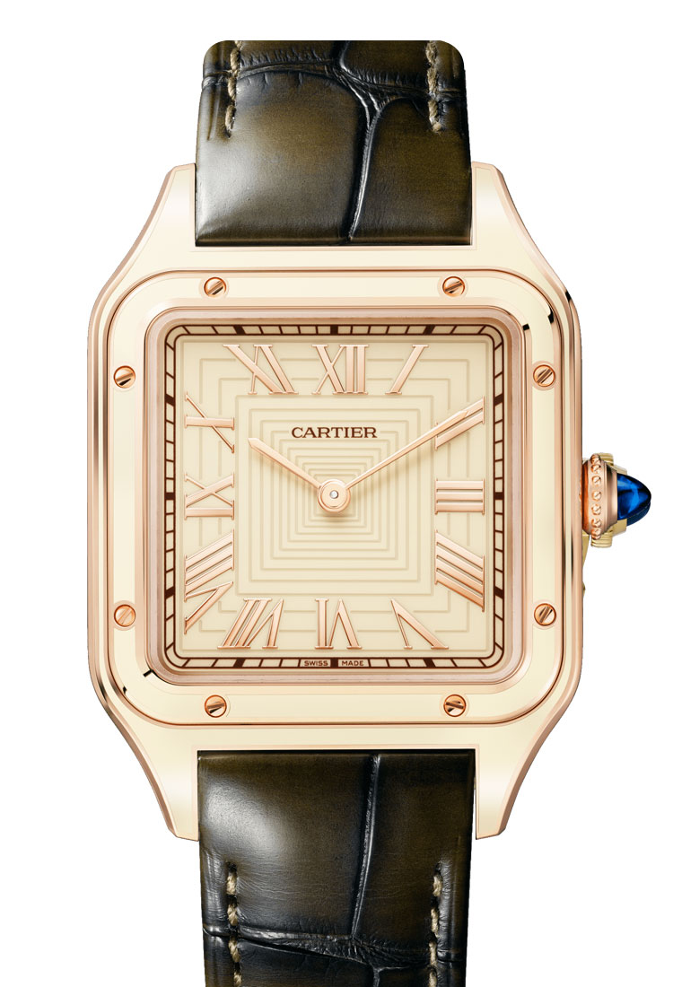 Santos系列2022年还是以Santos Dumont领衔,卡地亚分别推出铂金、玫瑰金与不锈钢等三款不同材质的新表,而它们也清一色採用真漆工艺装饰表壳,其中铂金款採用酒红色真漆表壳、表圈搭配白色面盘与红宝石表冠、玫瑰金款採米色真漆表壳、表圈搭配米色面盘和蓝宝石表冠,而不锈钢款则是配上黑色真漆表壳、表圈与黑色面盘与合成尖晶石表冠。细看面盘具有一层又一层的正方形图案,塑造出立体景深,彷彿有一种不断向面盘内部收缩的视觉动态感,吸引佩戴者注意手表上的时间。
