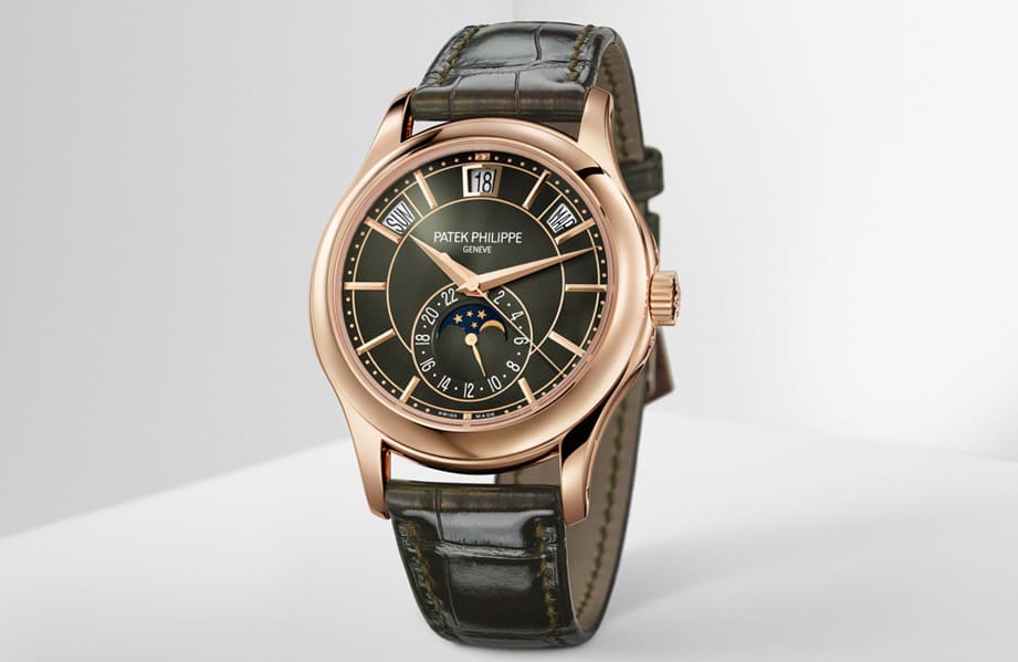 Complications 5205本来就有白金与玫瑰金两种款式,不过玫瑰金款的黑面或白面皆随着新款推出而随之停产,这也让Complications 5205目前无论白金或是玫瑰金款都已经走出传统黑面与白面的框架,前者为渐层蓝面,至于后者则是崭新启用PP手表比较少见的橄欖绿色面盘。