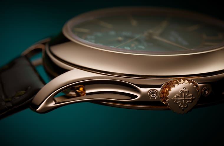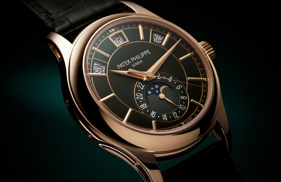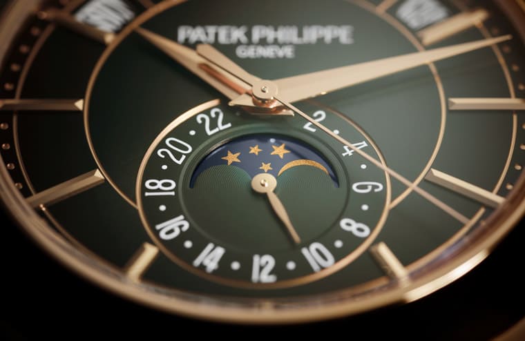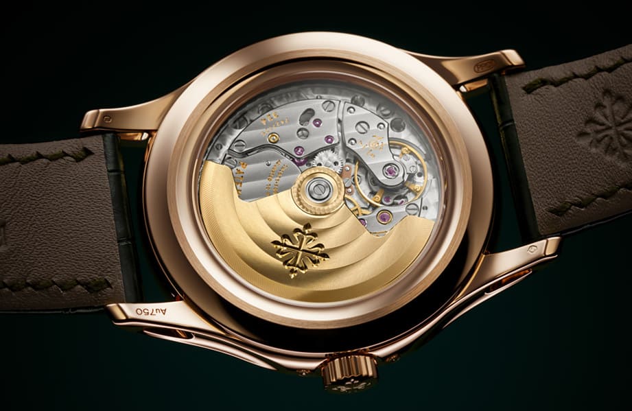 目光移到面盘上,其所使用的绿色调是百达翡丽近年大胆尝试的新色,除了5205R-011之外,2022年品牌也推出不少同为绿色调的新作回应市场喜好。5205R-011的绿色面盘带点渐层效果,也就是色泽从面盘中心往外逐渐变深至接近黑色,搭配面盘上的玫瑰金圆框、时标与指针等,颇有贵族般的风范。手表的年历功能简洁明瞭地由12点方向的星期、日期与月份窗呈现,佩戴者每年只需要在2~3月之交调校日期时间即可,其他大小月转换都交由机芯中的年历机制自主转换即可,相对一般日期表的便利性高出许多。此外6点方向还加码设置兼容24小时显示的月相视窗,让人在阅读日期资讯时,还可顺便掌握当天月亮的阴晴圆缺,别具一分诗意。