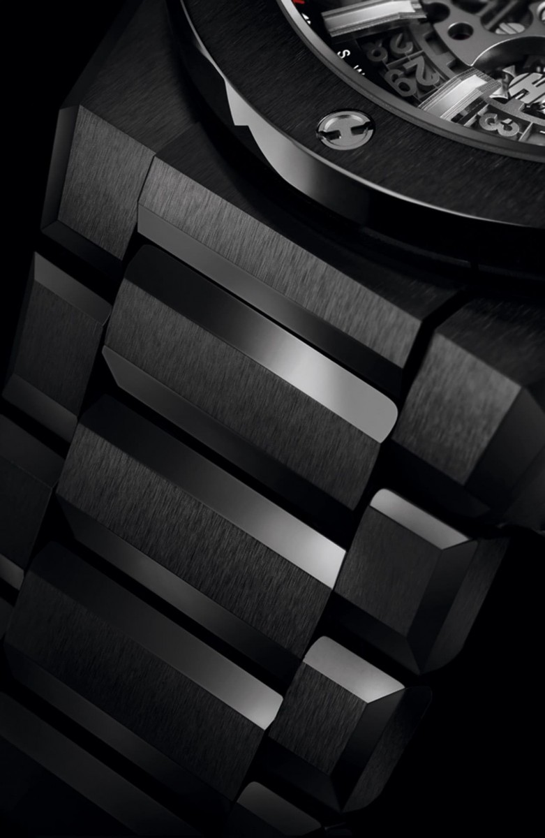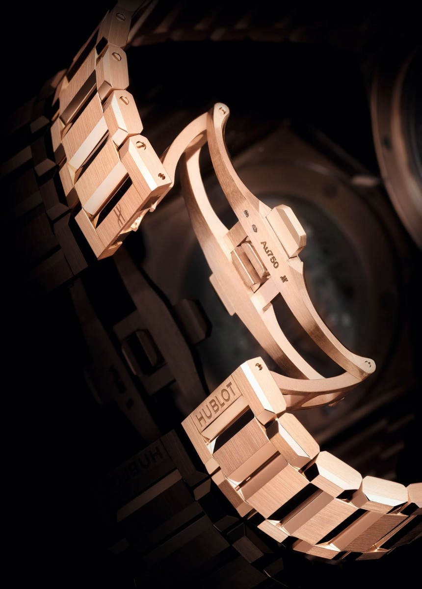 由表壳一路到链带的链节,宇舶坚持採用拋光与缎面打磨两种修饰工艺,其中链节表面主要採用缎面打磨,好处在于不容易突显外观的轻微刮痕,同时又能强化手表的运动个性,至于倒角部分则是藉由拋光处理提升零件的光泽感,散发高级制表的精致感。