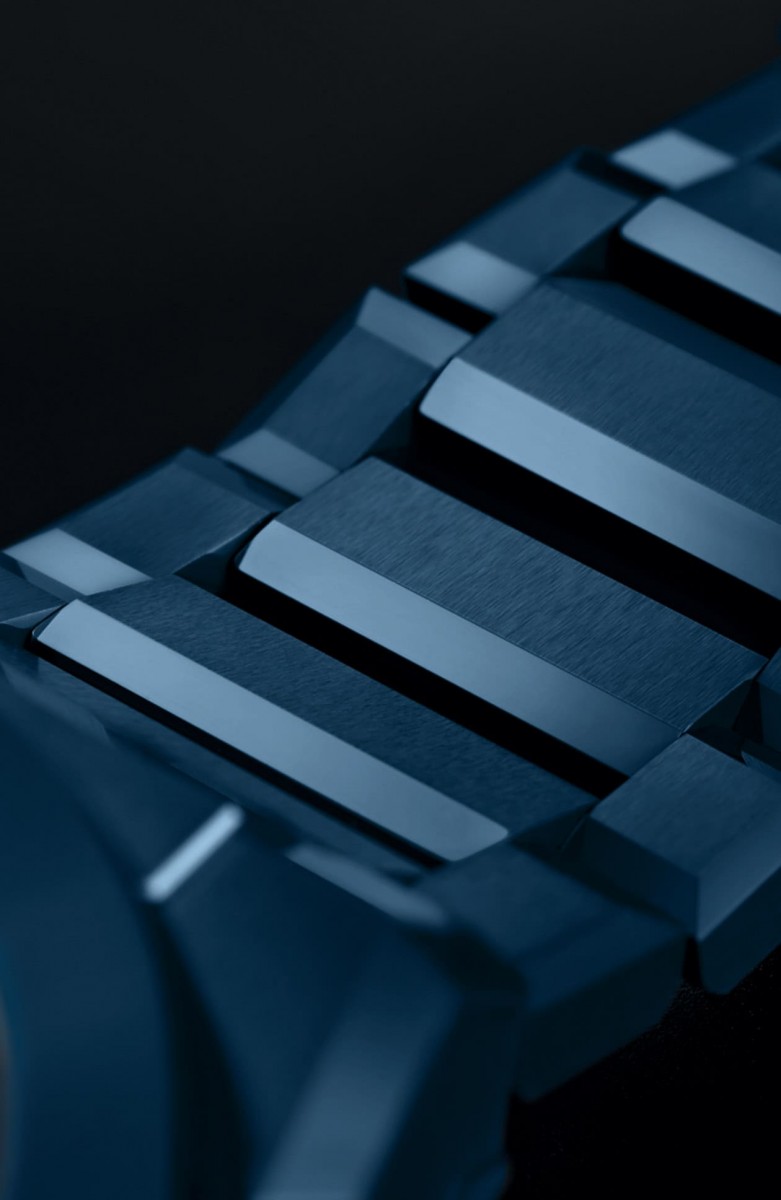 Integral链带由三道链节所组成,其中两侧的链节造型细看会发现彷彿是手表计时按把轮廓的延伸,而且每一枚链节表面的边角都还额外进行倒角处理,制作上相当费工,却也展现出宇舶链带独树一帜的外型印象。