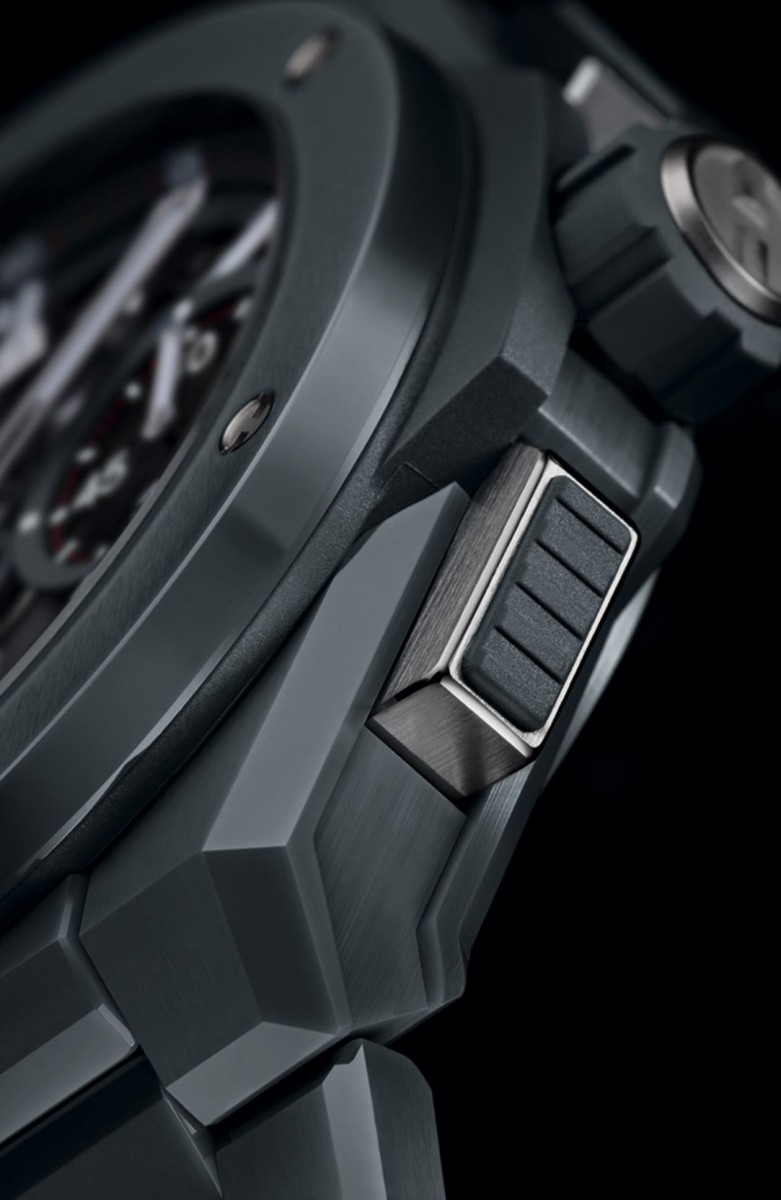 大爆炸系列着名的三明治表壳结构中原本拥有一键快拆式设计,不过Integral链带由于与表壳一体成型的关系,因此直接取消了表带快拆系统,如此一来可以确保链带的耐用稳定性,宇舶也顺着融入链带之便稍微调整了表壳造型,包括表壳两侧的黑色复合树脂结构、计时按把造型等都与过往的大爆炸手表呈现细微差异。