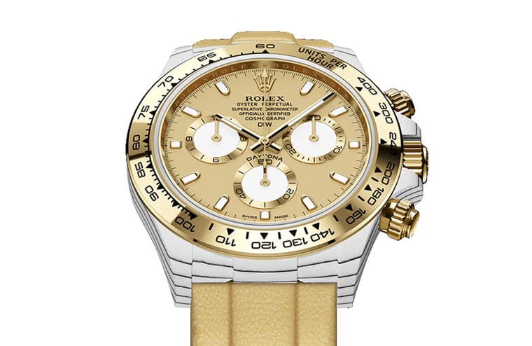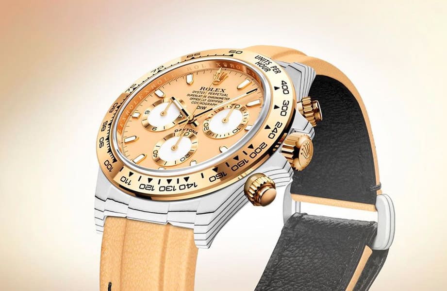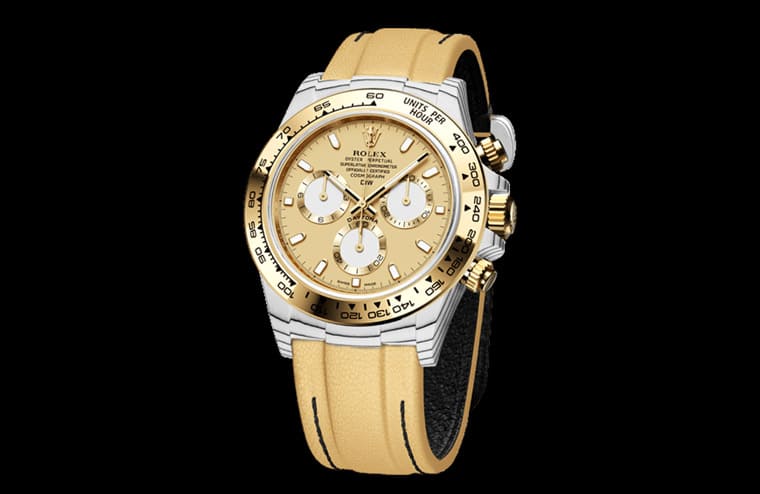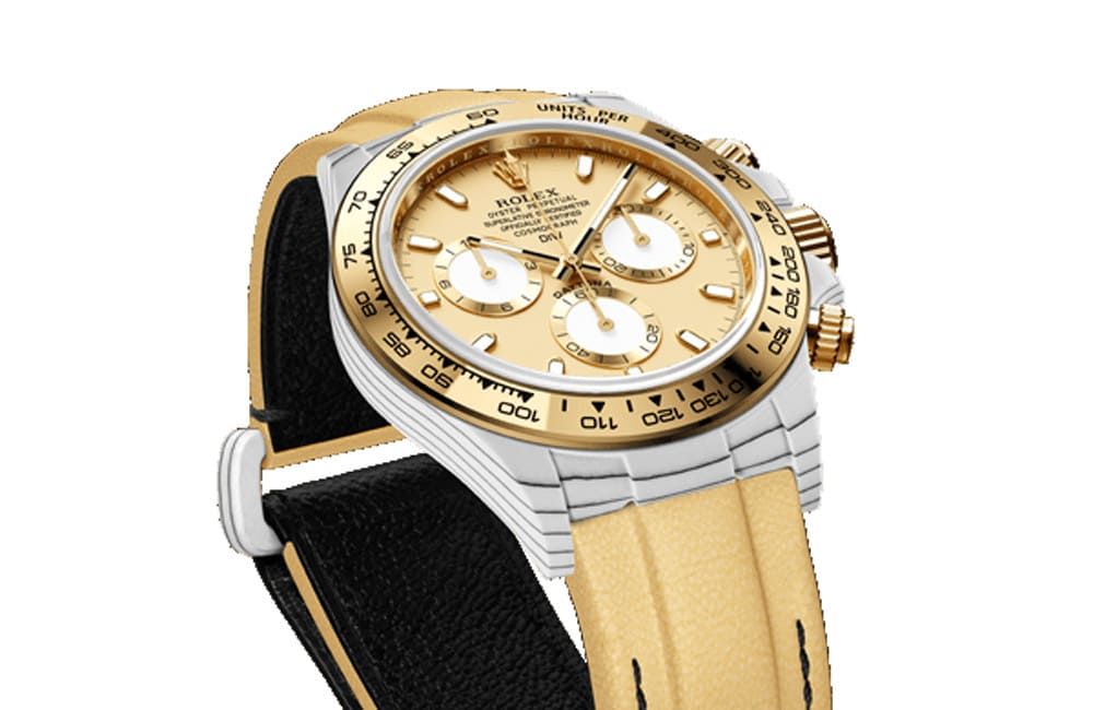 比起表壳与表带的创意突破,Daytona ”Golden Essence”的正面造型反而显得比较中规中矩,DiW尽量维持原厂的设计,主要调整就是面盘换上了与表壳和表带呼应的鹅黄色,同时在12点方向的一长串的字样中再增加一排”DiW”字样,品牌也顺便将6点方向的红色”DAYTONA”字样改成黑色;除此之外面盘的细节包括时标、指针与小表盘造型等都与原本的116508如出一辙。
