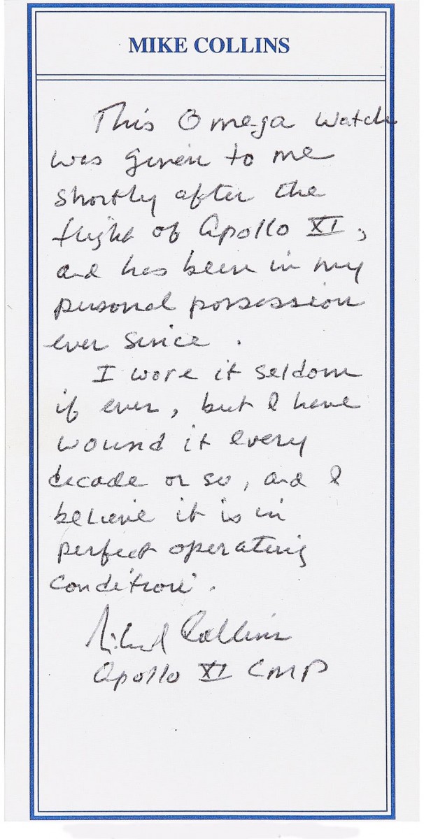 拍卖行表示,得标这款表的人会有一份额外大礼——一张柯林斯本人写给未来表主的亲笔字条,上头写着:「这只手表是欧米茄在阿波罗11号任务结束后不久送给我的,从那以后一直是我的私人物品。我很少戴它,但我每隔十年左右就会帮手表上链一次,我相信它处于良好运行状态。」(信尾加上署名)有着这张柯林斯事前准备好的遥远祝福字条,相信能将手表收藏价值推高一个档次,这也是为什麼手表现在就已经喊价到超过10万美金的程度,因为它对于钟表爱好者、太空迷乃至于全人类,着实都蕴含着珍贵的里程碑纪念意义。