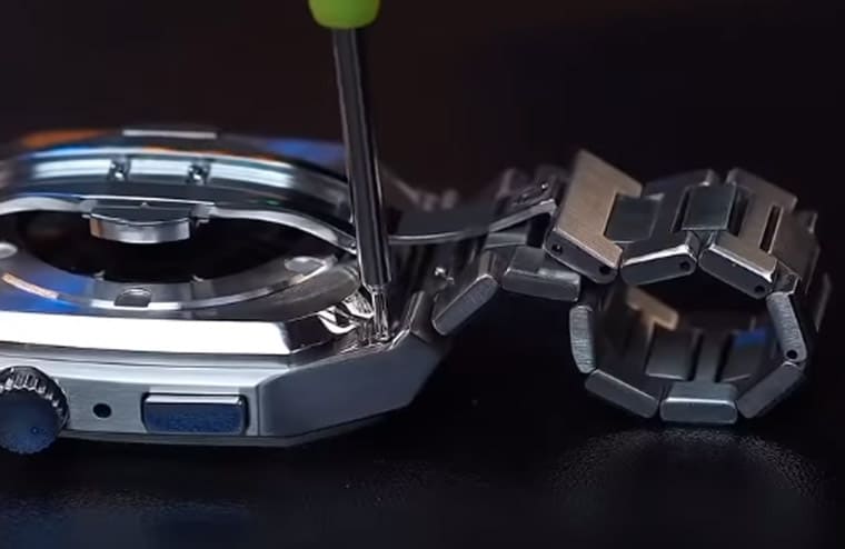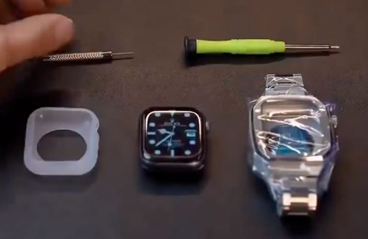 部落客在影片中首先准备好改装需要的材料,包括一个拆下表带的Apple Watch表头、一副Apple Watch表头的硅胶保护套,加上用来套在Apple Watch外部的不锈钢表壳与链带零件等,再加上改装要用到的螺丝起子,一切就绪后就可以开始进行改装。