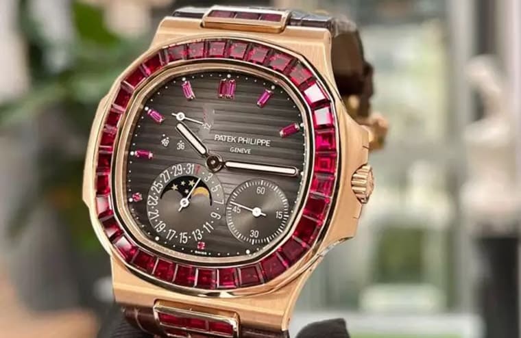 人在渡假状态中的潘瑋柏手上戴的是一款百达翡丽的玫瑰金Nautilus月相表,Nautilus 5712R这款表定价约150万台币,但是实际行情已达400~500万之谱,是目前高级市场很火热的热门表,但是!注意到潘瑋柏的5712R哪裡不一样了吗?那就是表圈和表耳上看起来是红宝石之类的宝石装饰,相同一款表有没有加上这些宝石点缀,稀有程度又差更多了,因为PP原厂其实还有推出表圈与表耳镶宝石的版本,且这种隐藏版的型号略有变化是为5724R。若以镶钻款式来说,目前在二级市场上这款表的价值超过千万台币。