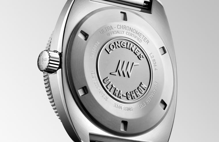 翻到表背于实底盖上同样可以见到与面盘相同的标志,底盖下方为浪琴表自制L836.6机芯,这枚机芯顾名思义震频达36,000VPH,用意在于减少震动或机芯位置变化的负面效应,让手表的走时变得更稳定精准。表款取得了日内瓦独立测试实验室TIMELAB的「超精密时计」(Ultra Chronometer)认证,受测对象需以成表进行为期15天的测试,期间会将手表置于8°C、23°C与38°C等三种