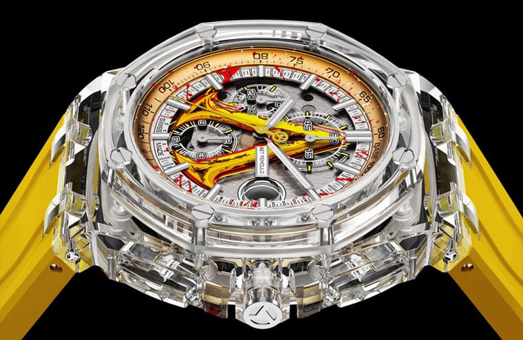 新款斯巴达系列作品名为”Lambda”,这是希腊字母的”Λ”的名称,而其实手表整体与同系列前两款有着异曲同工之感,因为它们都改成了蓝宝石水晶材质表壳,包括表冠和计时按把也都是蓝宝石材质,这点有别于市面上多数的蓝宝石表壳手表,且表款依旧是搭配橡胶表带,不过有别于Lochagos的白色橡胶表带与Chameleon的绿色橡胶表带,”Lambda”换成了黄色橡胶表带,这点也与表款面盘的设计有彼此呼应的用意。