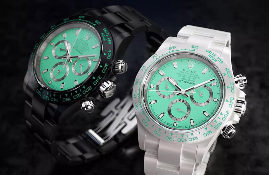 AET REMOULD的Daytona ”Biscay Green”陶瓷表分别衍生出黑陶瓷壳与白陶瓷壳两款,营造出有别于金属表壳那种晶莹剔透的美感,包括表壳、表圈与链带都用陶瓷制成,也不论白或黑色陶瓷,搭配Biscay Green绿色都很搭——白色呈现出温润如玉的质感,黑色则是散发鲜明对比,强化手表的视觉震撼力。