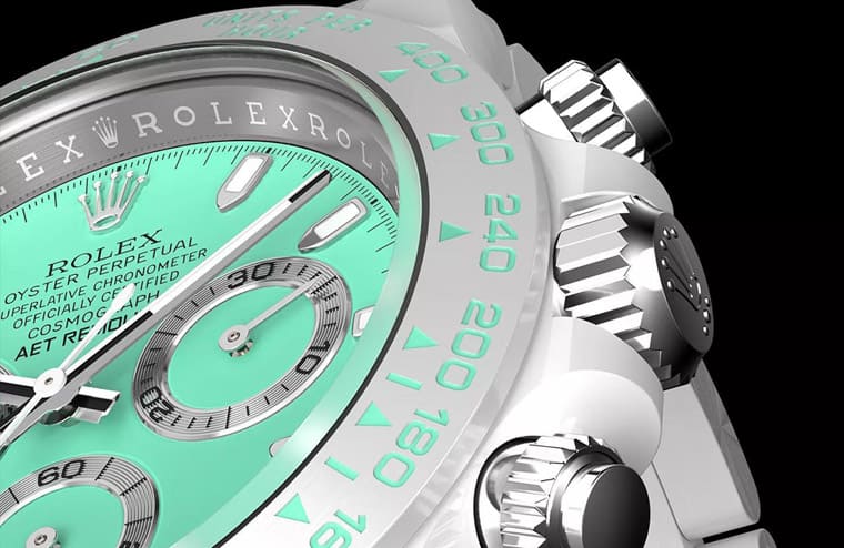 ▲两款Daytona ”Biscay Green”陶瓷表各限量18只,参考价为59,600欧元。