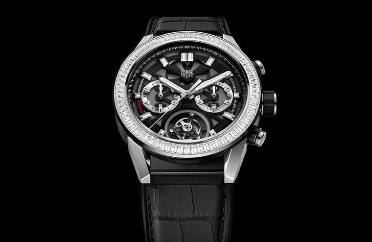 手表独特之处不只在表圈上的美钻,泰格豪雅将手工打造的Monaco V4陀飞轮「轻盈」版本安置其中,中间部分採钛金属,上方则为碳纤维材质,轻量化设计有助于让机芯保有65小时的动力储存,在复杂功能机芯中属于高水准表现,且这枚Heuer-02T自动机芯还通过了瑞士天文台认证,走时精准度不愧于陀飞轮本色。