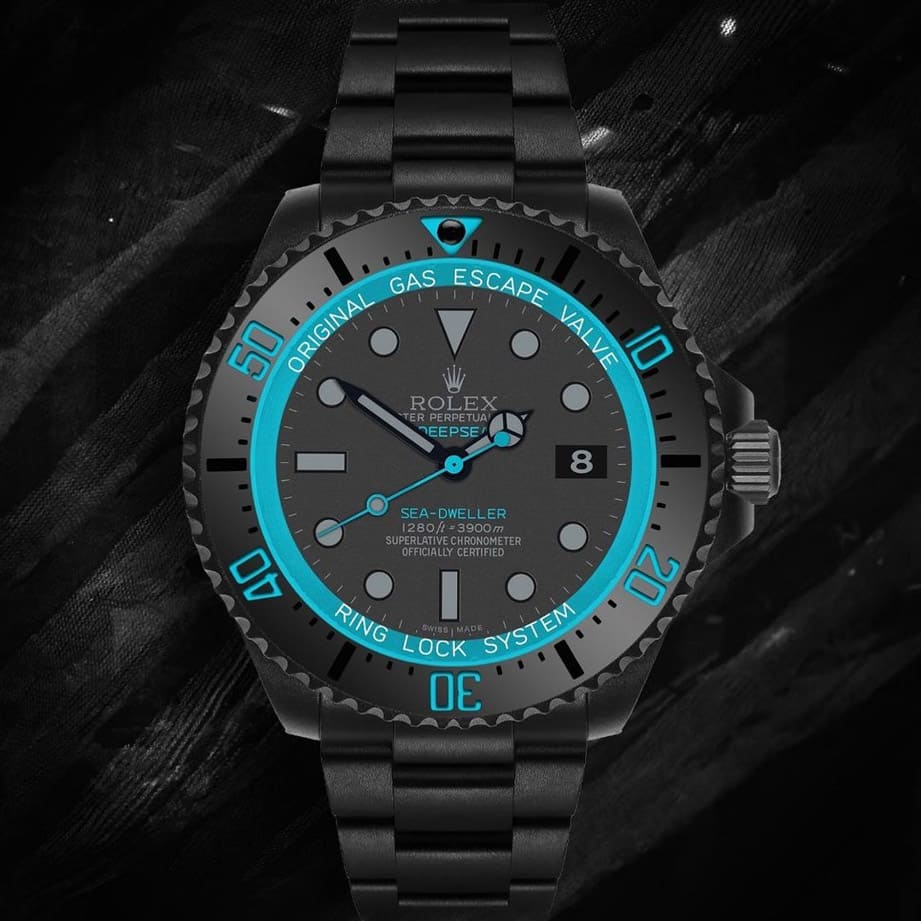 除了手表外观镀黑并加上水蓝色细节外,WILDMAN也针对Sea-Dweller Deepsea的面盘进行细节改造,包括时、分指针改为黑色,日期显示盘改成黑底灰字,同时时针与时标上的夜光涂料也同样改成灰色,加上12点和6点方向的品牌标志与系列名称等也都换成灰色,这让黑色面盘看起来的层次感更强烈。不只如此,改装表品牌又额外把”DEEPSEA”和”SEA-DWELLER”等字样添上水蓝色,这使得表款名称在黑色面盘上相对显眼,在时尚的黑色外观中蕴含一些属于夏日的清爽气息。