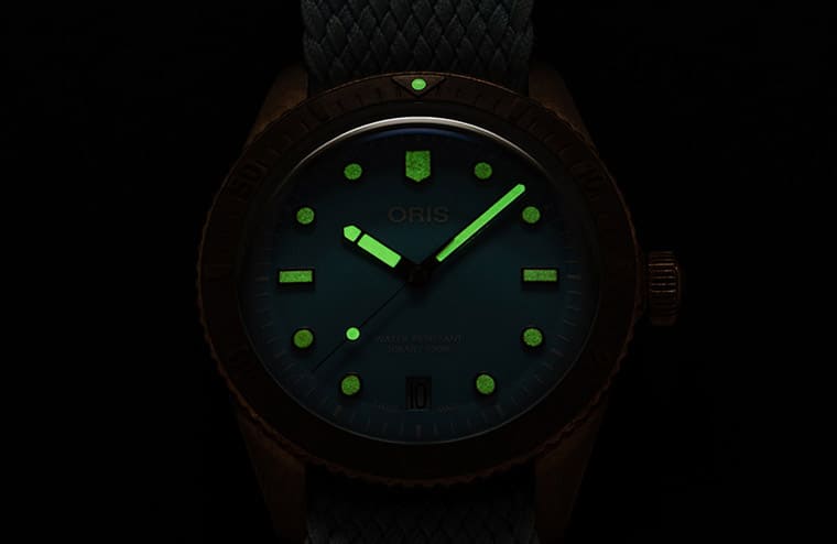 Divers Sixty-Five “Cotton Candy”同样皆搭载品牌主力的733机芯,其拥有日期快调与停秒装置等,让人可以更快速精准调校时间,而ORIS也考量到有些佩戴者可能会在长时间接触青铜材质后产生过敏反应,因此手表的底盖换成了不锈钢材质,从而降低过敏的机会,戴表戴得更舒适。