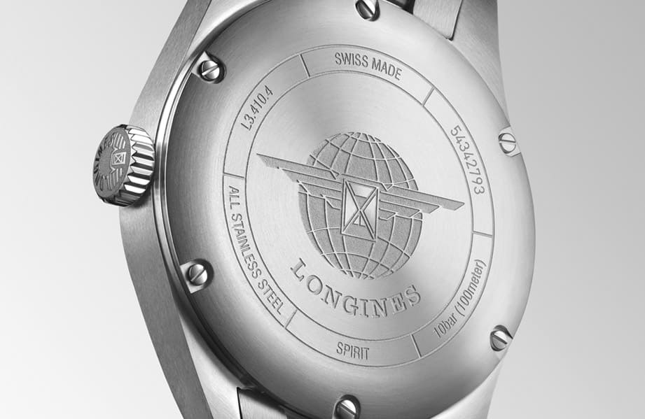 ▲表背实底盖鐫刻品牌代表性的飞翼沙漏图案,并确保手表的防水性能达100米。