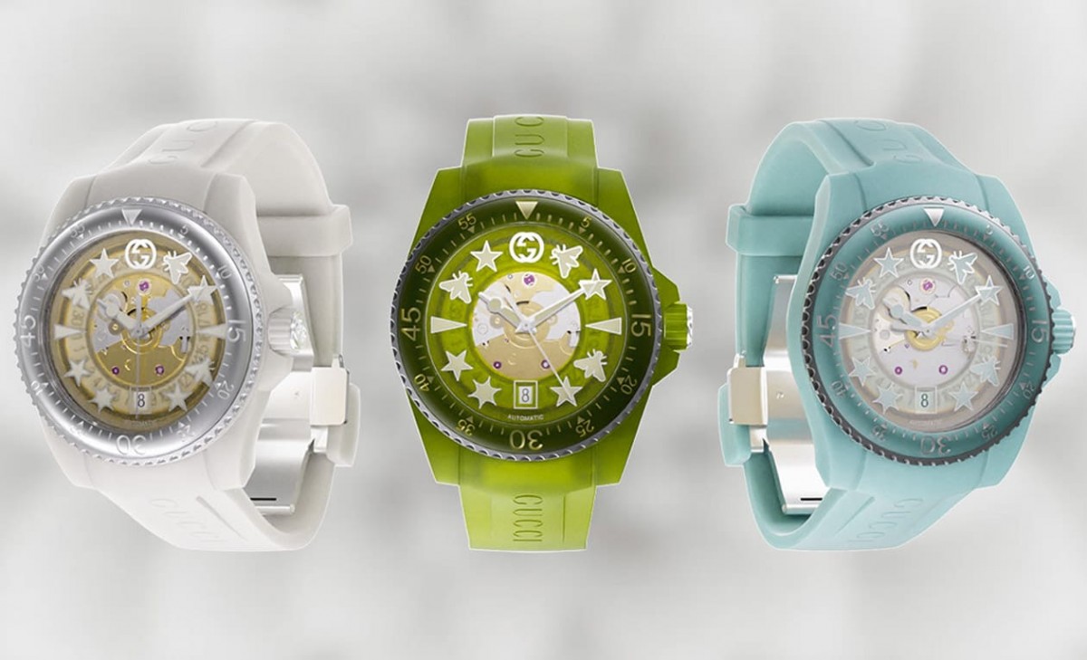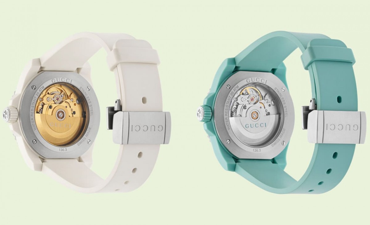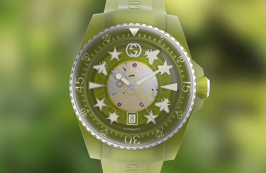 ▲GUCCI新款Dive潜水表改换上自动机芯,表壳则以生物源塑胶搭配再生钢材质制成。