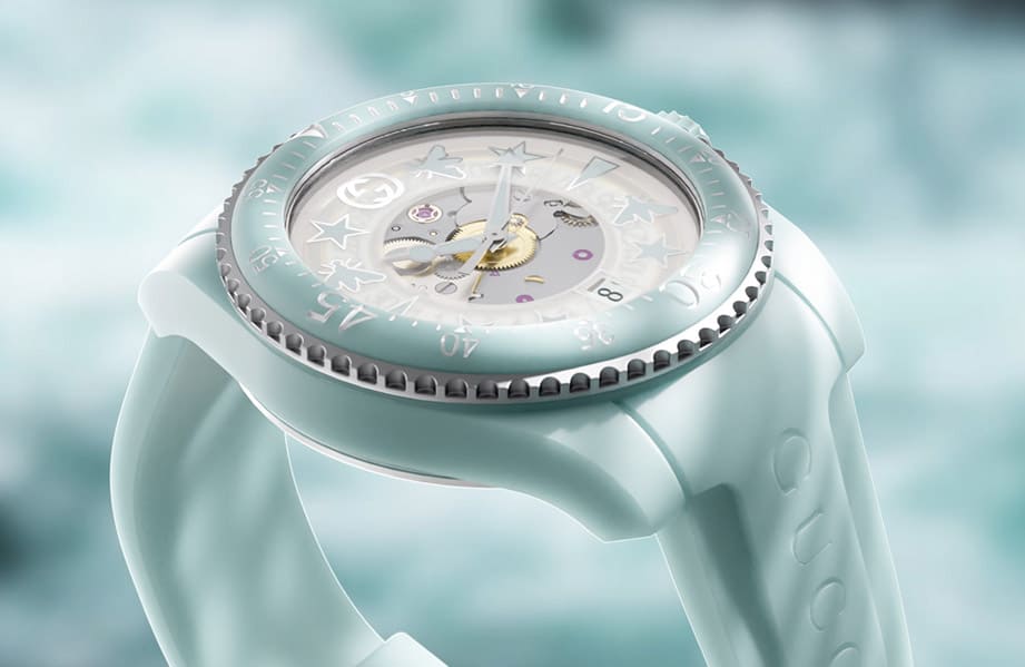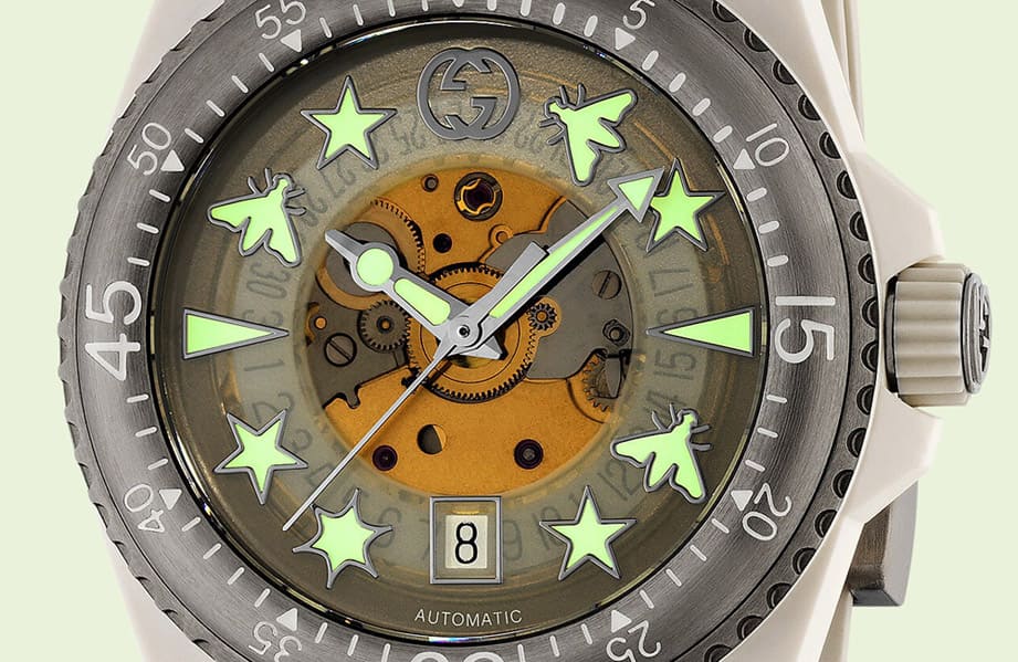 面盘上拥有Dive系列招牌的多元造型时标,包括GUCCI的双G Logo、星星与蜜蜂等交错排列成为12个时标,同时面盘内圈还开了一个圆形视窗,露出底下机械机芯的结构,而多元造型时标环的部分用的又是偏半透明的材质,所以底下的日期环不会赤裸裸地呈现于佩戴者眼前,这样的好处在于手表显时不会被干扰,但又同时透过巧思展露出机械表的本质。