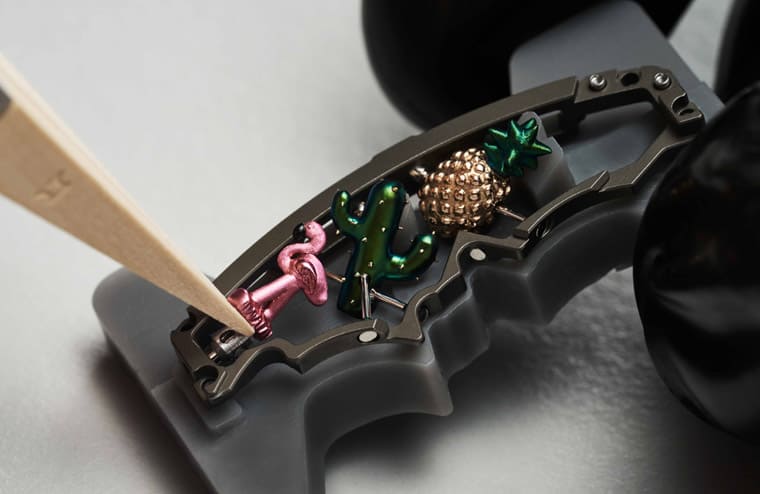 针对第一个挑战,RICHARD MILLE採用一块技术底板(用于支撑机芯)、一块倾斜的辅助底板(用于固定面盘左侧的装饰组件),并在其上一一装饰绽放的花朵、温暖的太阳、可口的凤梨、蓬勃生长的仙人掌、粉红色的火烈鸟、色彩亮丽的彩虹等元素。
