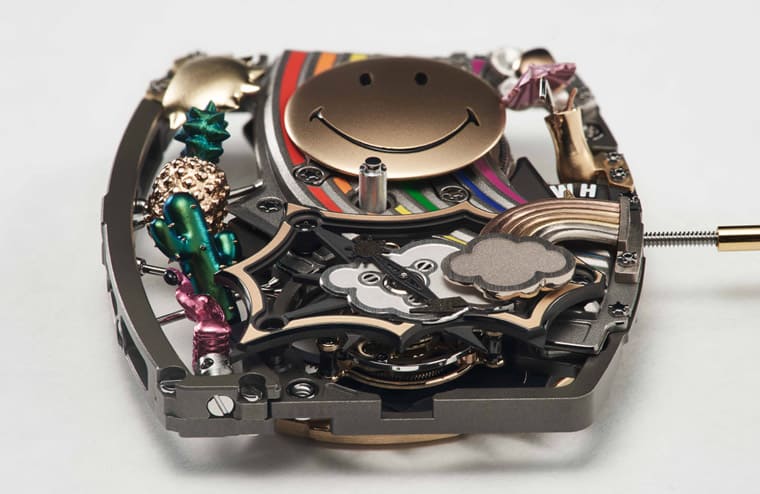 由微喷砂和手绘处理的黄金制成的Smiley图案被装配在另一个轮组机构桥板之上,该桥板由经拋光倒角和边缘拉丝的微喷砂ARCAP®材质制成,这道大型彩虹与Smiley图案形成生动的呼应,手工涂绘的彩色漆散发出淡淡的光辉。