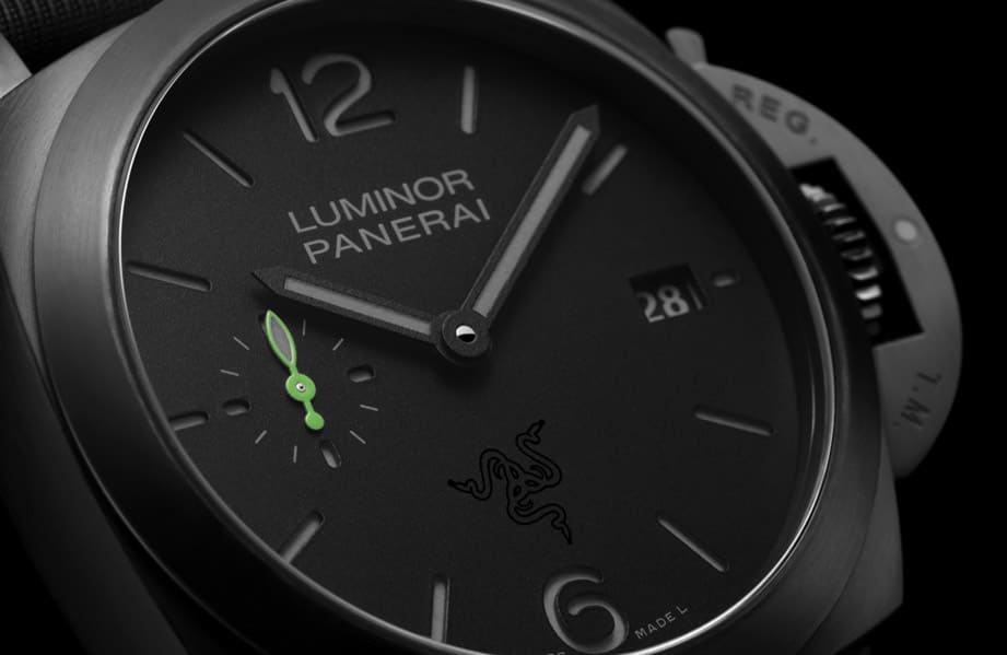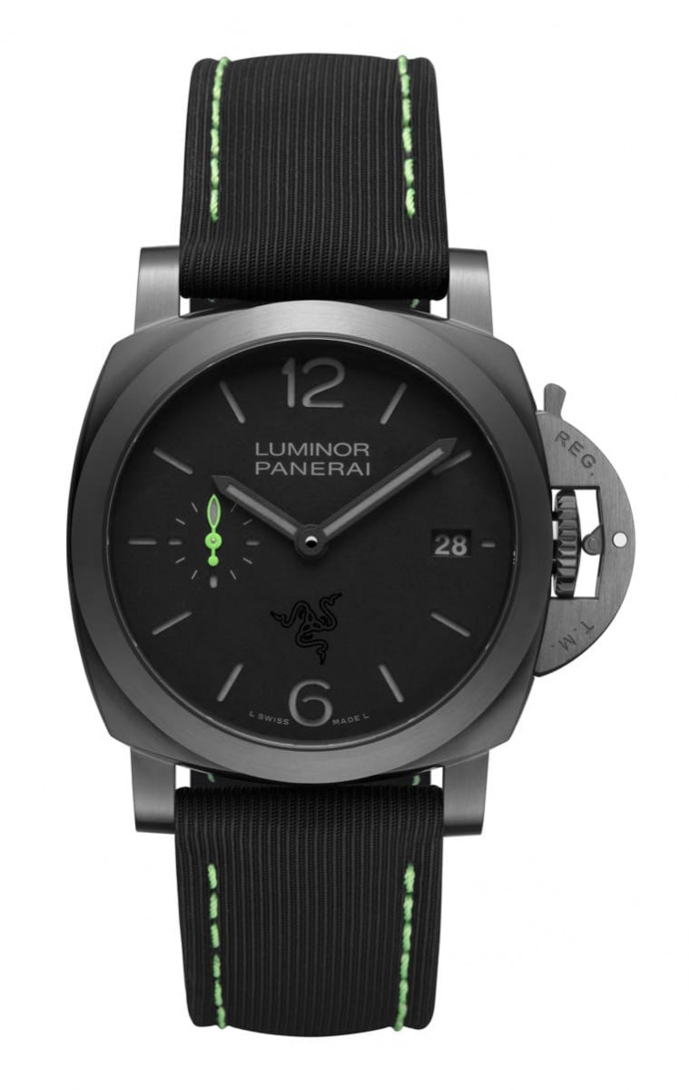 ▲沛纳海和电竞周边品牌RAZER雷蛇共同打造出一款Luminor Quaranta Razer特别版,手表融合了雷蛇公司Logo与配色,看起来别具潮流酷味。