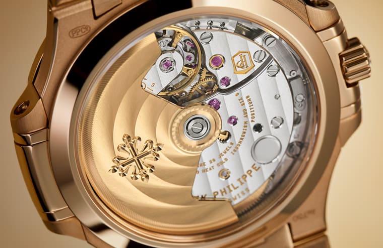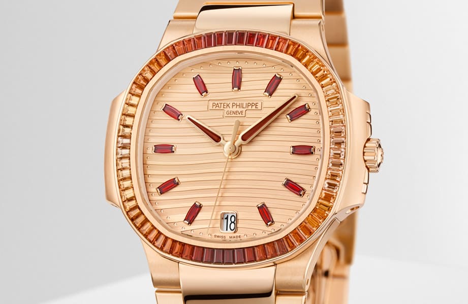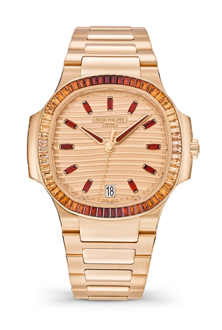 7118追上时下风行的彩色宝石圈潮流,新作採用玫瑰金材质之餘,另在表圈镶上68颗长方形锰铝榴石,宝石的顏色从12点到6点方向的干邑色,逐渐转变为9点到3点方向的香檳色,形成双色渐层效果。此外手表的镀玫瑰金面盘上也镶有11颗尖拱长方形锰铝榴石(6点方向为日期窗故不另设时标),彩色宝石的装饰效果令玫瑰金表壳与链带的外观魅力更上层楼,与同型号其他款式衍生出同中求异的个性。