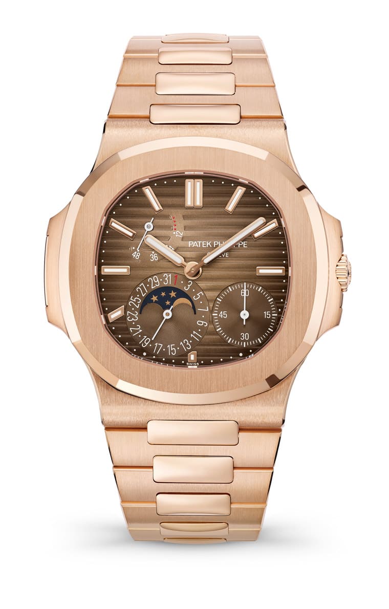 这款日期月相表迎来玫瑰金表壳链带版本,面盘顏色则与既有的玫瑰金皮带款稍微有点出入,改成咖啡色放射状并呈现黑色渐变效果,面盘整合指针式日期显示、月相显示以及动力储存显示,属于金鹰系列功能较进阶的作品,而在5712/1R-001登场后,目前5712型号刚好有两款搭配金属链带与两款搭配皮革表带的作品。