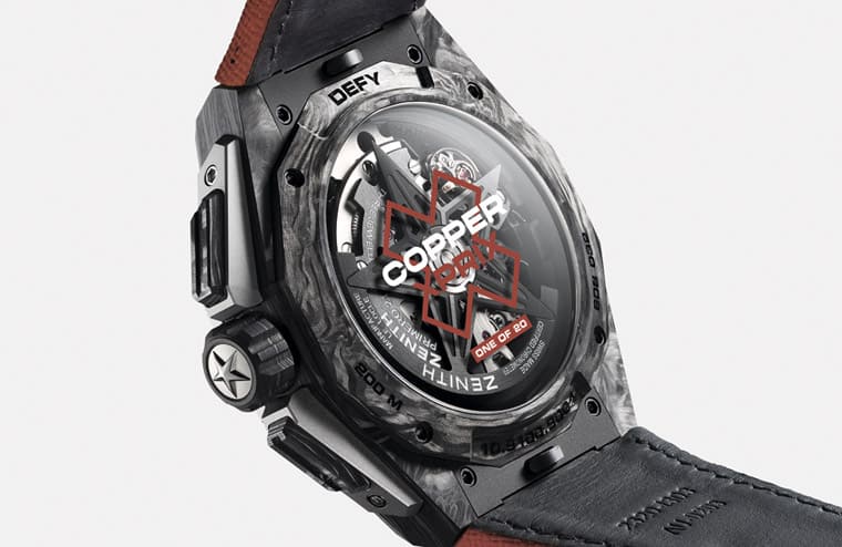 ▲透明底盖印有Copper X Prix的专属标志,佩戴者还可窥见El Primero 9004机芯细节。