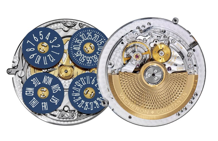 表背露出手表搭载的2460 G4自动机芯,特色在于机芯以四个转盘与视窗分别显示小时、分钟、星期和日期,前两个显示器採用滑动式,后两个则採用跳字式机制,同时其的22K金自动盘还饰有密密麻麻的马耳他十字图 案,机芯中所有零件均经过精细打磨处理,达到符合日内瓦印记的严格要求,2460 G4的动力储存为40小时,若较长时间没有戴表,下回重新戴上前就必须要先上链再戴会比较保险。