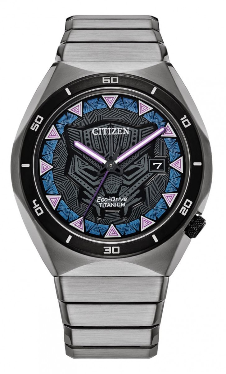 表款的表圈以深灰色树脂压印形成,上面刻有简约的10分单位刻度;至于面盘部分则是这款特别版的精髓,CITIZEN于面盘中央放上一个精致的黑豹头盔浮雕图案(和CA0297-52W表背的图案系出同源),图案周围以充满Wakanda风格的蓝色和紫色图腾装饰,其中紫色三角形刚好可以充当时标,而且它们的表面与指针同样都涂上夜光物料,因此在黑暗环境中还是可以清楚阅读时间。