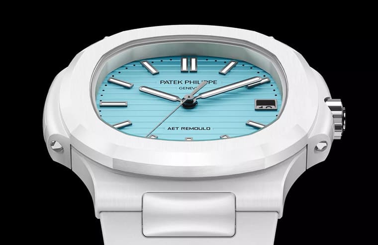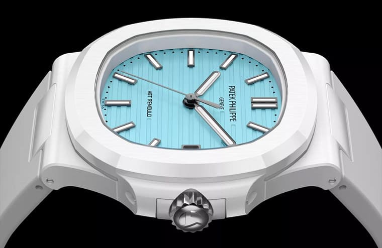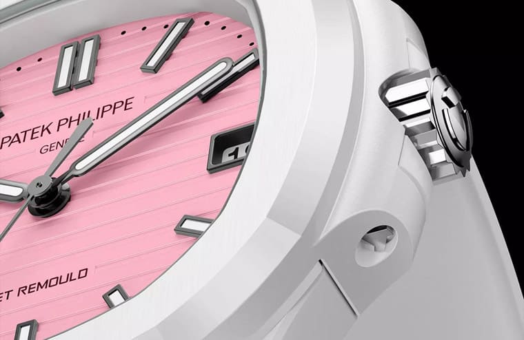 两款金鹰5711改表都是出自于Nature Collection,因此它们的表壳和表带等与先前的Biscay Green也都一样——AET REMOULD以白色陶瓷制作表壳并搭配白色橡胶表带,如此一来手表的视觉印象趋于简洁俐落,同时不论面盘採用湖水蓝(跟TIFFANY蓝很类似)或是粉红色,作为金鹰系列特徵的水平条纹也都没变,加上表壳造型等这些经典元素都完整保留的情况下,AET REMOULD巧妙地透过材质与配色的调整,赋予大家熟悉的5711大三针截然不同的新样貌。