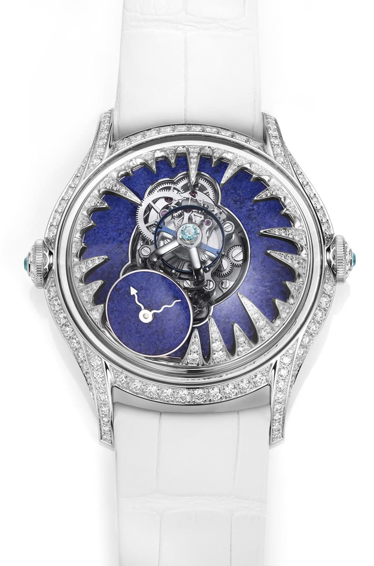 为了诠释冬季主题,珠宝设计师特别要求MB&F做出以下改良,例如他不想要手表正、反面出现金色元素,因为青金石和钻石具备的蓝色与白色,通常更能勾起人们对冰天雪地的印象,因此如果手表出现金色元素,有可能会破坏观者对手表主题的想像,所以他特别商请MB&F替换掉手表本有的金色元素,这听起来稀松平常,背后却牵涉到重头来过的大工程,例如摆轮就必须要先经过蓝钢处理才能组装。Tarpin另外也希望MB&F可以陀飞轮轴心以及左右两侧表冠顶部镶嵌的钻石改为更稀有的湖蓝色帕拉依巴(Paraiba)碧璽,虽然钻石并不会和冬季主题冲突,但因为手表包括表壳与表耳以及穹顶镜面下都已经镶了相当多的钻石,如果不稍加变化,手表的视觉惊艳度就会因此而有所影响,所以Tarpin才会神来一笔地决定採用同为蓝色调的帕拉依巴碧璽点缀。