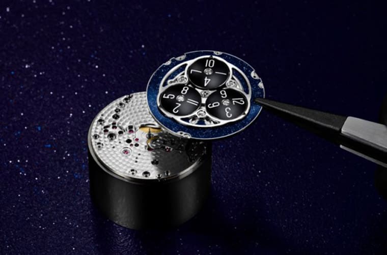 ▲面盘为砂金石材质,漫游小时机械装置就置于面盘中央,其包括三枚小时转盘、中央公转轮以及面盘外缘的分钟刻度等。