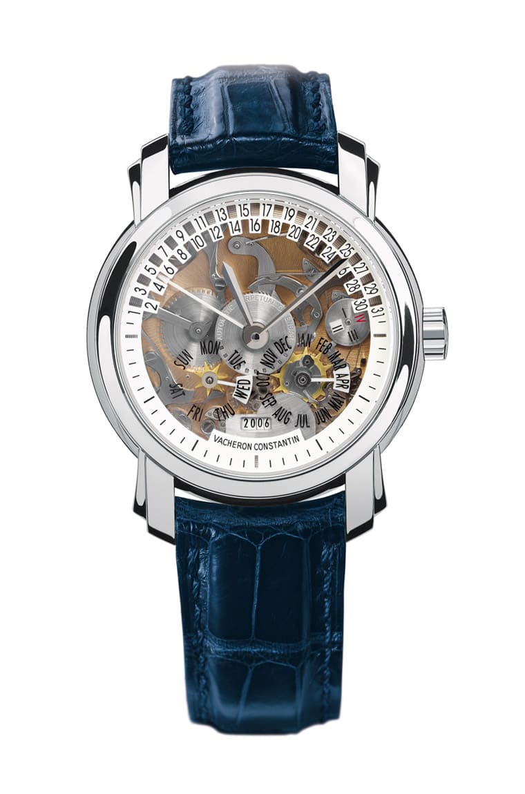 江诗丹顿先前于2008年打造这款表的铂金开面版本,露出面盘下方复杂的机械结构以及机芯零件的细致打磨,它以逆跳功能展示日期资讯,意味着表主可以在每个周末结束前欣赏到指针瞬间跳返归零的精彩画面。