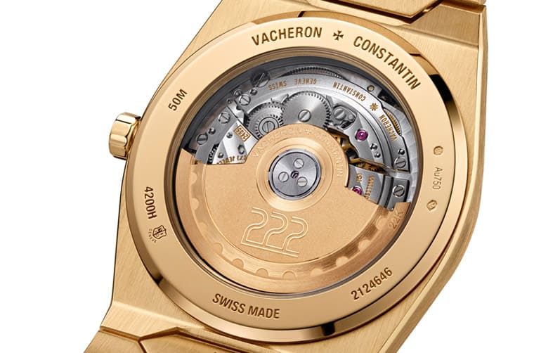222运动表44018採用实底盖,内部搭载的是1120超薄机芯,Historiques 222换上了江诗丹顿现役的2455/2机芯,这枚机芯震频为4Hz,厚度还比1120机芯多了1.15mm(所以复刻版的表壳才会比原作厚一点),而且为了因应现代的市场喜好,品牌也把表背换成了透明底盖,让人可以一窥机芯堂奥,像是一眼就可以看到机芯的22K金自动盘,同时自动盘也仿照222运动表44018的底盖,鐫刻上数字”222”。2455/2机芯具有停秒装置可以将手表调校至更准确的时间,实际操作表冠调时会发现转动表冠的触感满扎实的,让人感觉机芯结构似乎更严谨复杂。有关机芯的精准度和零件作工已有日内瓦印记进行把关,这点不会让人感到担心,有玩家实测机芯精准度,经过上机实测,在静置状态下手表的日差一开始为+2.6秒,等过了24小时候则是+7秒,平均下来还是属于优于天文台认证的水准,在正常佩戴的情况下,这种日差相对还是展现出机械表的高水准。