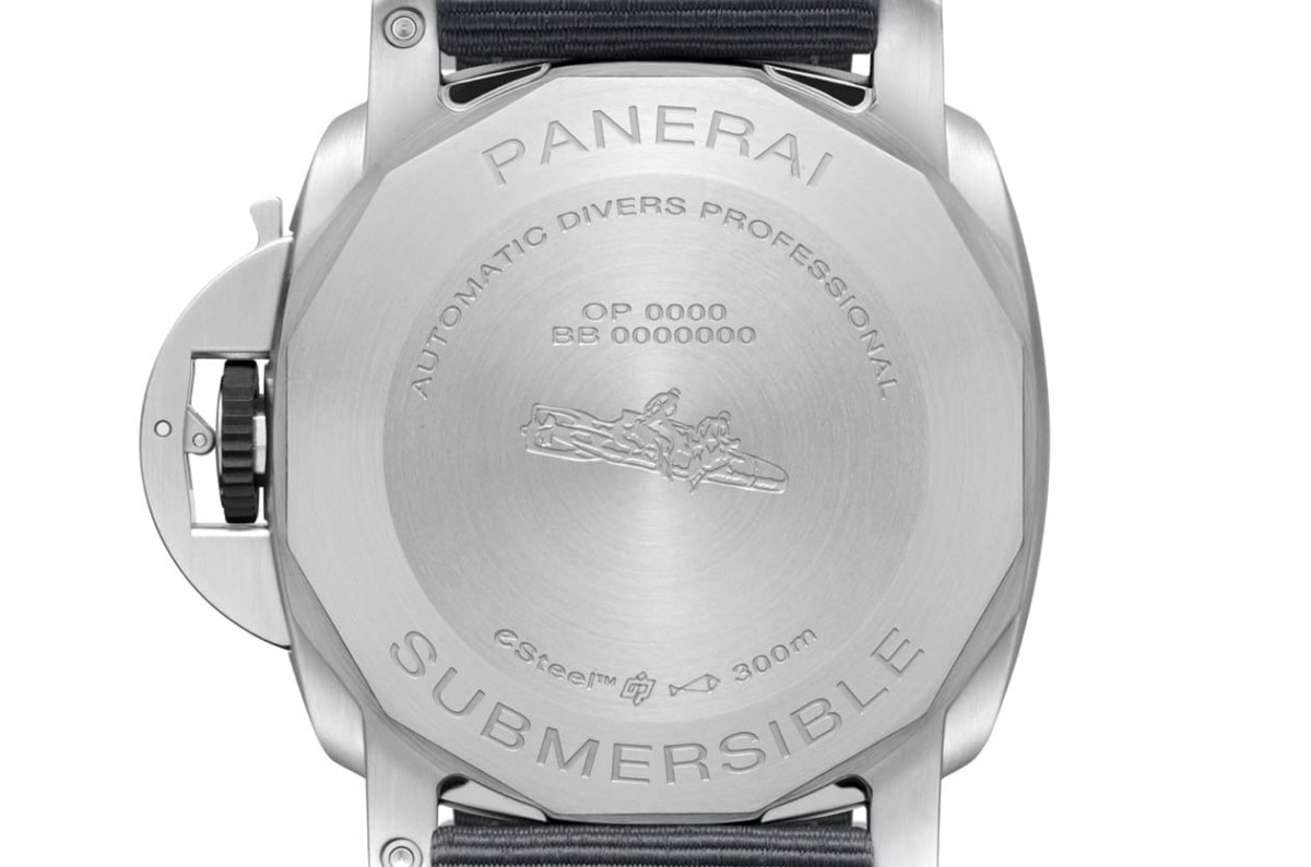 ▲背底盖亦採eSteel™精钢制成,底盖中央刻有慢速鱼雷图案,既能彰显沛纳海为军方制作潜水装备的传统,也呼应腕表的专业防水性能。