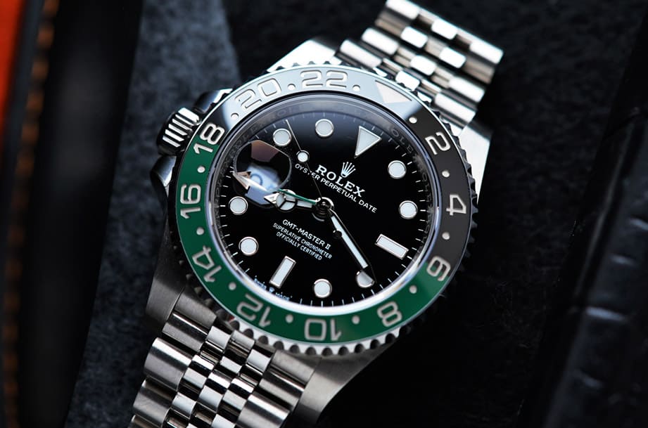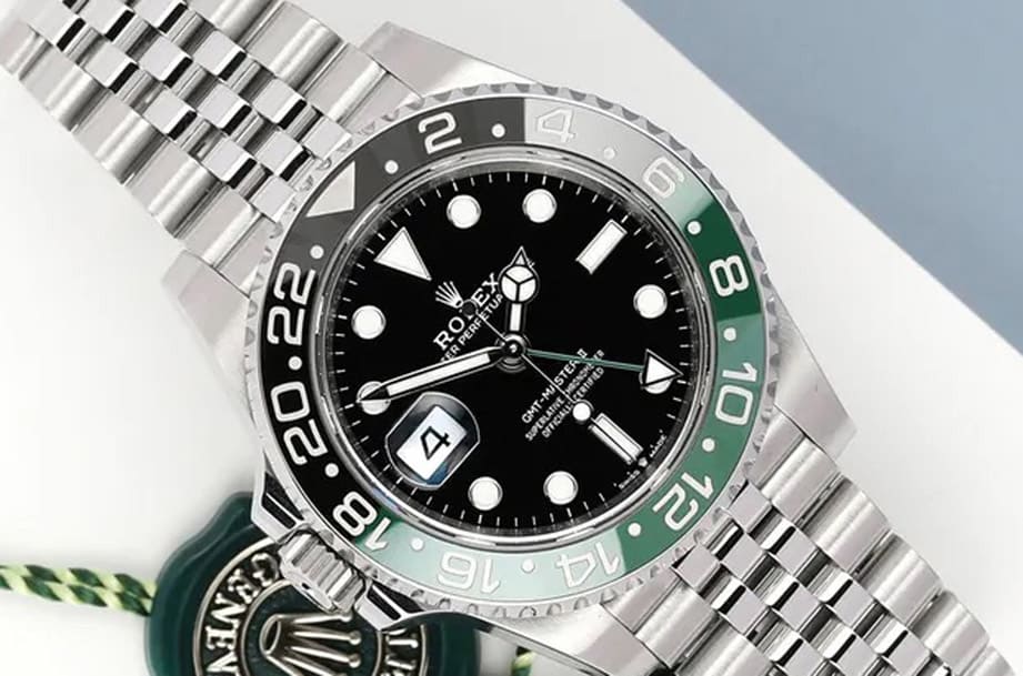 劳力士2022年最让人印象深刻的作品,GMT-Master II 126720VTNR一定榜上有名,除了表款材质为不锈钢、採用系列先前未曾出现过的绿、黑双色陶瓷表圈等特色外,更重要的是它是品牌近代首见的左冠表作品,论特殊性就足以迷倒一票表迷与收藏家,也因此这款被国外表友暱称为“Sprite”(雪碧)的风云表,在去年刚上市之时,二级市场价格冲得又高又快,根据高级手表市场调查研究机构WatchCharts提供的资料,126720VTNR一推出就曾经站上将近45,000美金的行情高峰,对照手表定价11,250美金,溢价率是恐怖的290%。