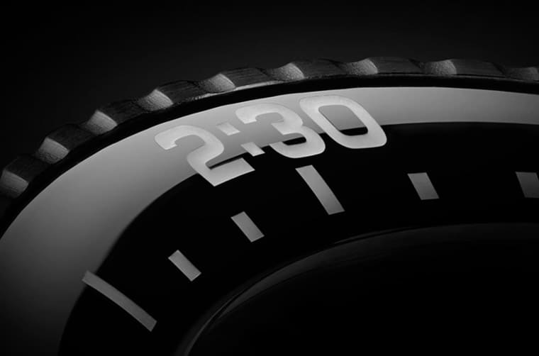 通常带有单向旋转表圈设计的潜水表,其表圈刻度会以60分钟为准,其中有些作品会特别详细列出前15~20分钟刻度,让佩戴者在计算下潜时间时能够更精准地判读,因此通常潜水表圈的分钟刻度会在3、6、9点方向依序印上”15”、”30”与”45”的阿拉伯数字;然而五十噚Tech Gombessa明显不同了,表圈改在2、4、6、8与10点方向印上阿拉伯数字,且它们依序是30、1、1:30、2和2:30,数字之间乍看好像有点跳跃,但其实品牌环绕表圈一周的单位不是常见的1小时,而是3小时,先有了这层认知后,在看到表圈上的数字就会有豁然开朗的体悟。
