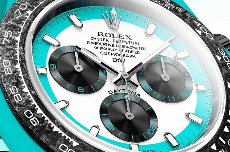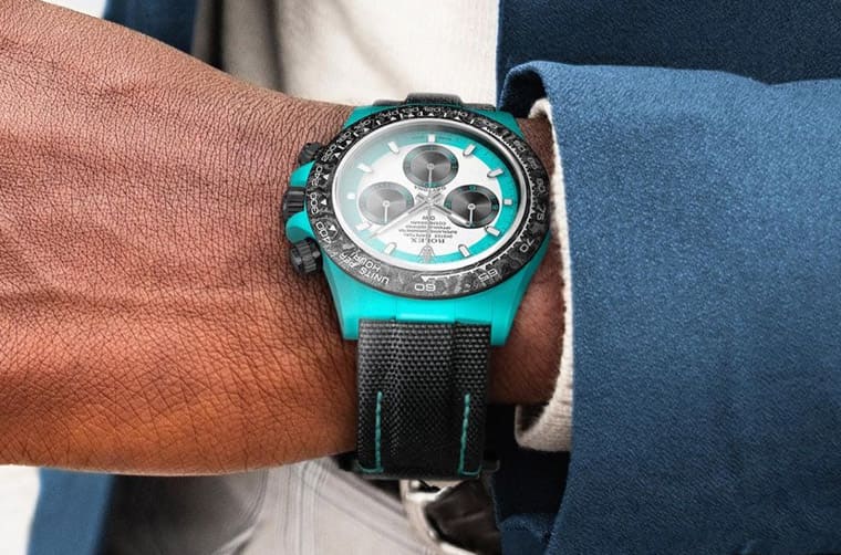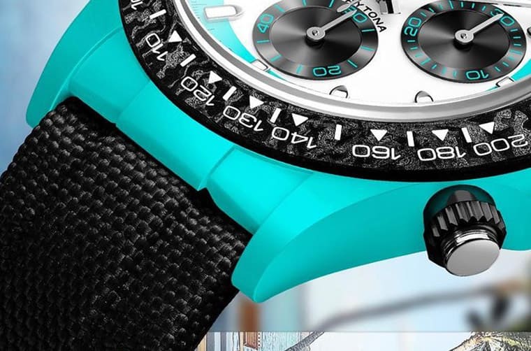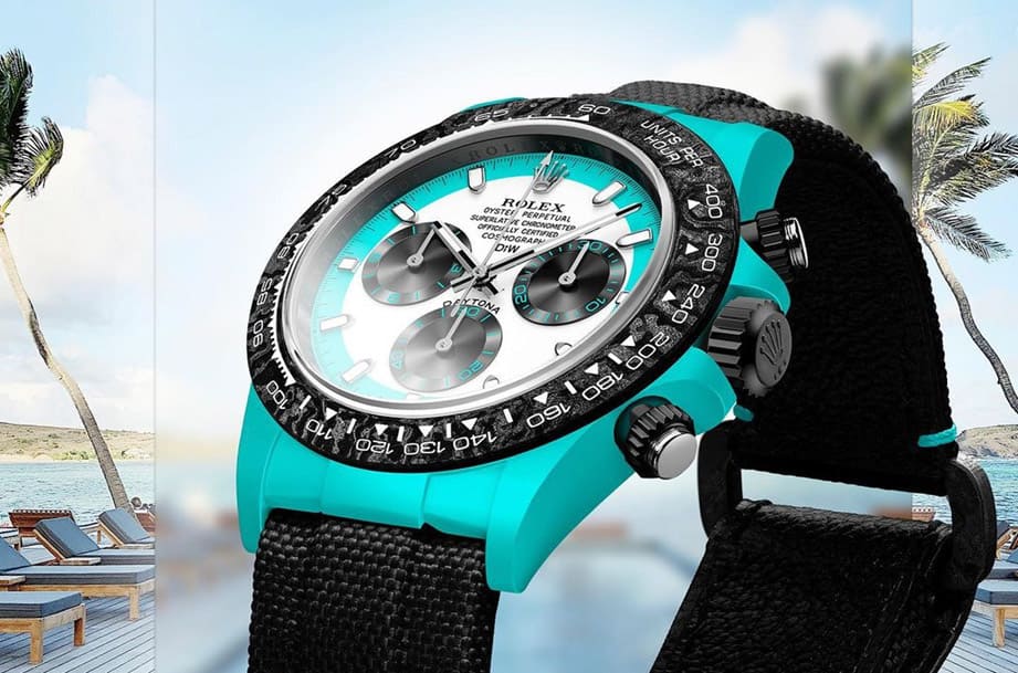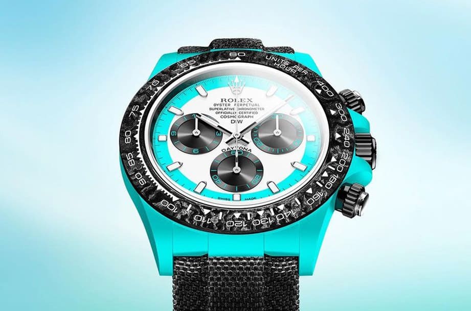 ▲DiW以加勒比海小岛圣巴瑟米集体为灵感,创造出Daytona ”Celeste”,手表的蔚蓝色外观搭配碳纤维表圈令人惊艳。Source:Designa Individual Watches