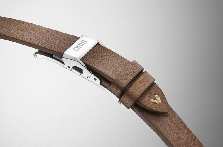 ▲表款搭配Cervo Volante永续鹿皮表带,发扬ORIS推崇的环保理念。