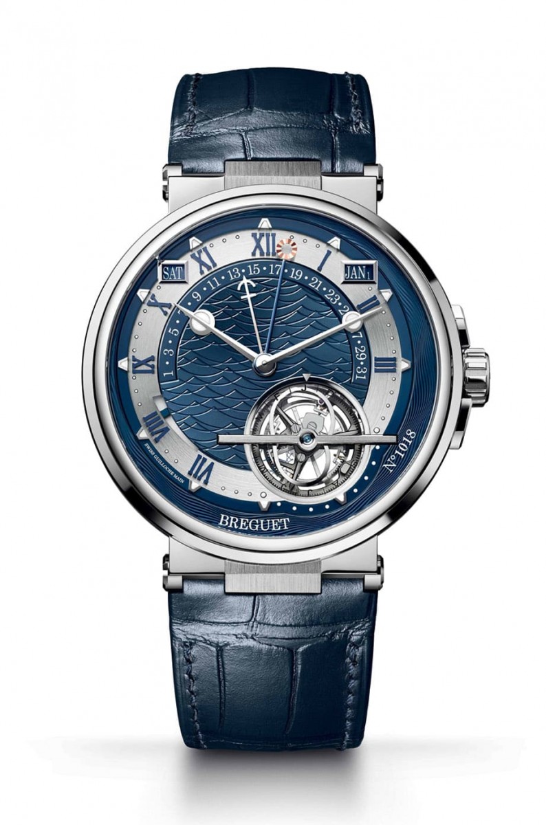 面盘设计跳脱过去Marine系列的既定框架,例如其外缘有带有几何立体感的条纹,面盘内圈则有波浪状的机刻纹路,整体造型让人一眼即识该系列的海洋风格。表款除了万年历与陀飞轮装置等,亦纳入品牌作品较少见的时间等式功能,负责指示真太阳时的指针与分针置于同轴,透过针尖为镂空圆形的指针便能逕行推算其与时针所代表的平均太阳时之间的差距。581DPE机芯採用环形自动盘设计让底板得以大方呈现于佩戴者眼前,机芯发条盒上鐫刻了风向玫瑰航海罗盘图案,同时底板上还刻有法国皇家海军一级战舰「路易士皇家号」的图案,细节处处呼应系列的创作精神。