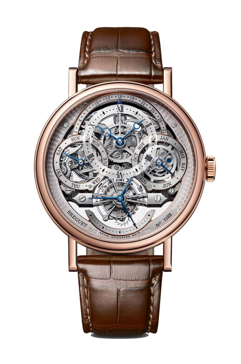 18K玫瑰金材质/558QP3手动上链机芯/偏心时、偏心分、小秒、逆跳日期、星期、月份、闰年显示/万年历功能/陀飞轮装置/蓝宝石水晶镜面、透明底盖/防水30米/表径41mm