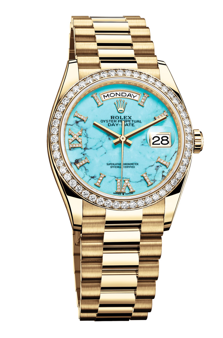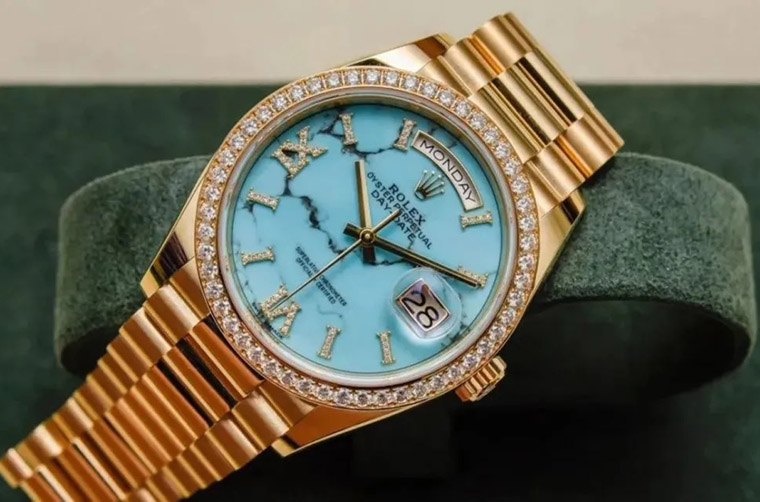 而在目前愈来愈多的TIFFANY蓝面手表中,有一种作品的稀有度明显高出一截,那就是採用真正绿松石宝石制作面盘的手表,近期这种正港「绿松石面盘」手表最着名的案例要属劳力士2019年推出的Day-Date 36 128348RBR,这款表光是定价就高达NT$ 1,996,000,根据高级手表市场调查研究机构WatchCharts网站资讯,它在国外的二级市场价格溢价率约达26%,可见收藏家对这款不仅是TIFFANY蓝色,而是连面盘本身都是用珍贵宝石制作的作品兴趣愈来愈浓。