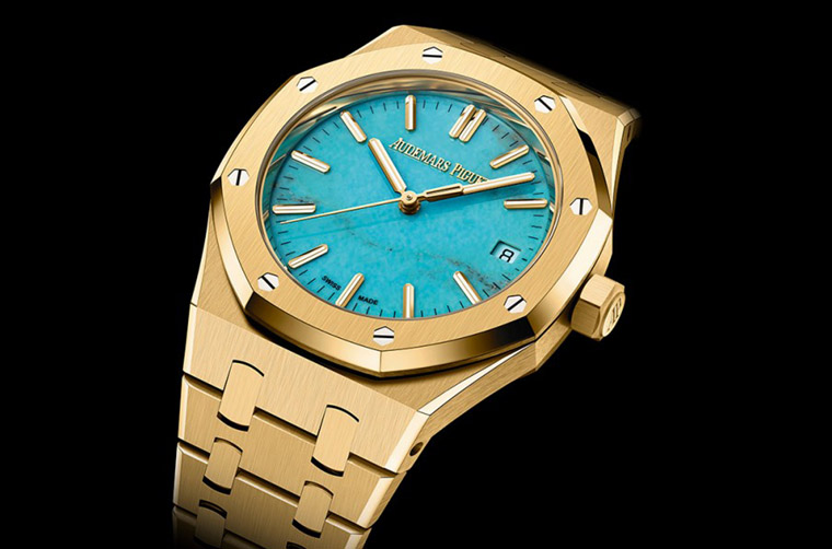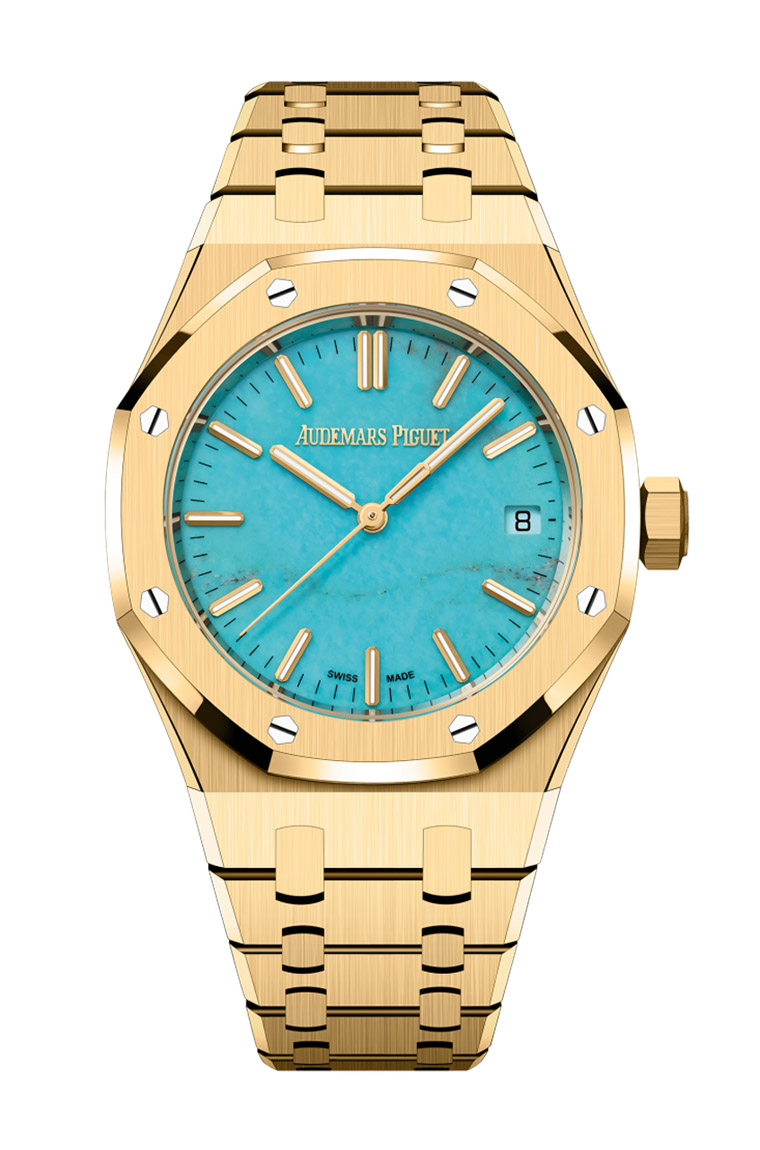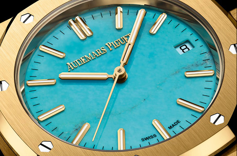 ▲爱彼在2023年新发表一款皇家橡树自动三针表,表款的亮点除了黄金材质,还有面盘改採绿松石宝石,营造强烈视觉效果。