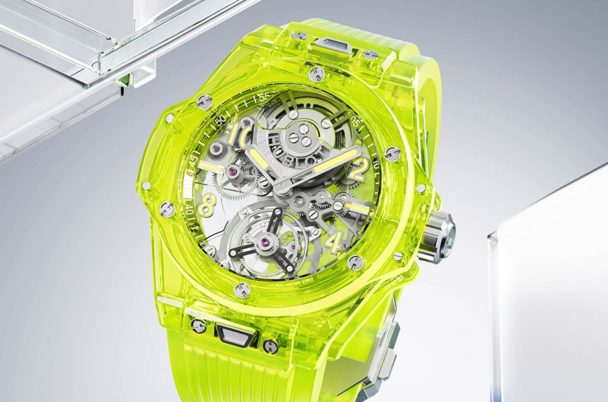 ▲2023年LVMH钟表周宇舶同时发表三款新作,其中Big Bang陀飞轮萤光黄SAXEM手表第一次启用萤光黄色蓝宝石氧化铝及稀土矿物,再创彩色透明表壳新境界。