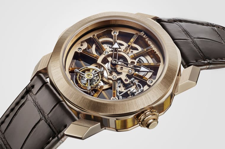 与Octo Roma水晶陀飞轮一样,Octo Roma Precious Naturalia也是一款搭载BVL206手上链机芯的陀飞轮,不过宝格丽乃是将这只表结合矿石元素以及贵金属表壳,展现另一种稀有高贵的质感。表款採用玫瑰金表壳搭配棕色鱷鱼皮表带,这两种元素替手表营造更偏正式优雅的风格,此外宝格丽于机芯内部镶嵌了一片虎眼石,其餘11条支撑桥板上也有虎眼石点缀,如此一来虽然无法展现机芯的镂空架构,但是珍稀矿石带有的自然纹理遂成为手表独一无二的装饰,相同的陀飞轮机芯、相同的系列,经过宝格丽的创意与工艺激盪下,蜕变出同中有异的样貌,对于不同喜好的收藏家各有其难以抵挡的诱因。