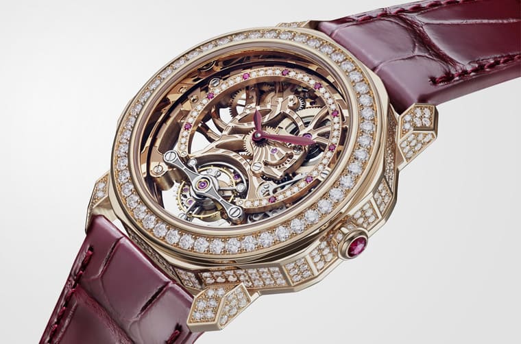 玫瑰金材质/BVL208手动上链机芯/时、分显示/陀飞轮装置/表壳镶钻267颗,约重2.48克拉、表圈镶钻48颗,约重1.58克拉、表冠镶红宝石1颗、面盘镶钻及红宝石/蓝宝石水晶镜面/防水30米/表径38mm