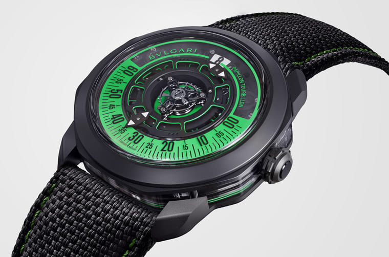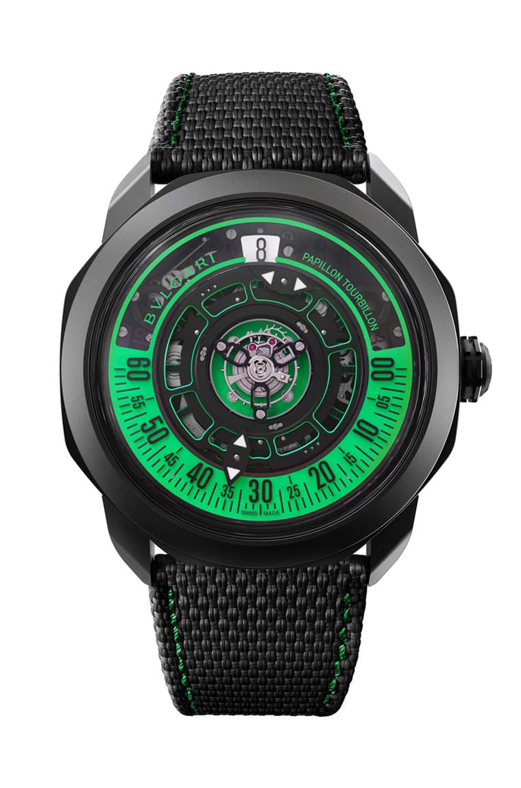 针对高阶功能方面,Octo Roma也有令人眼睛一亮的作品陆续问世,2023年如Octo Roma Striking Papillon Tourbillon蝴蝶中置陀飞轮和Octo Roma Striking Tourbillon Saphir水晶陀飞轮都有改款新作,两者都採用镀黑钛金属搭配黑色橡胶涂层鱷鱼皮表带(两侧缝线都是萤光绿色),前者蕴含表坛少见的中置陀飞轮,并以12点方向的跳时视窗显时,至于分钟显示则仰赖面盘下缘的半圆形刻度,以品牌专利的菱形指针轮流负起指示时间的公用,这种蝴蝶显时机制的特别之处再在于两枚菱形指针在一个小时即将结束之际,原本指示的指针会转为水平,另一枚则转成垂直,像是舞者在上演一齣精采的舞码般吸睛。宝格丽将蝴蝶显时机制的刻度、表背的动力储存显示都覆上萤光绿色调,如此一来手表在暗处的显时效果会更清楚,平常佩戴在手上则是更有摩登时尚感。