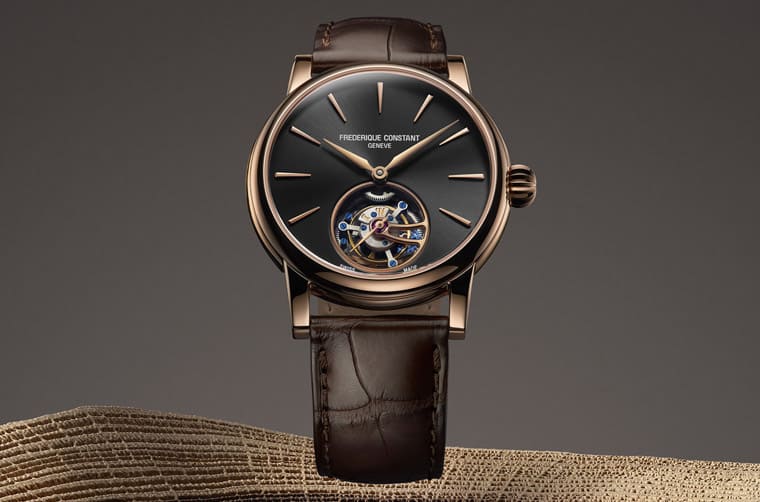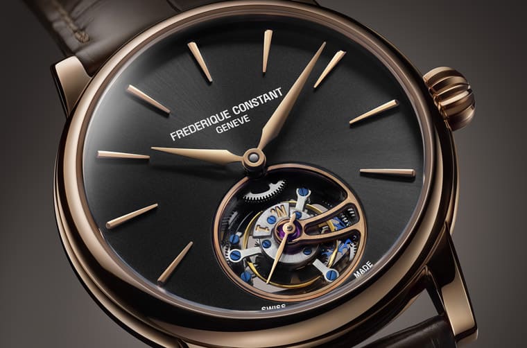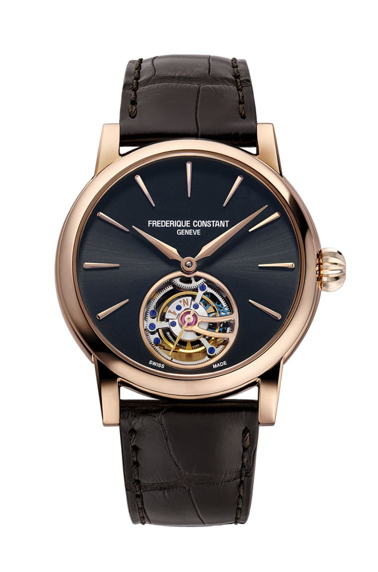 表款搭配棕色鱷鱼皮表带以及黑色面盘烘托玫瑰金材质的贵气,包括指针与时标等也同为玫瑰金色,黑色面盘以太阳放射纹处理可以反射出多变的光芒,而这次乍见手表的陀飞轮装置时,会让人感到手表似乎变俐落了,之所以会有一种惊喜感是因为过去搭载FC-980机芯的陀飞轮手表,其陀飞轮框架会固定在一枚延伸至面盘的桥板上,使得面盘右下角额外多出一块银色的机芯零件,其与陀飞轮的圆形框架刚好组成一个类似逗号的造型,看起来格外有特色。