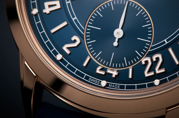 5224R採用玫瑰金材质搭配磨砂绒面效果的蓝色小牛皮表带,面盘镶上玫瑰金立体时标以及三枚玫瑰金针筒形指针(其中一枚镂空处理的是两地时间指针),面盘中央有同心圆纹装饰,6点方向的小秒盘也有同样的纹理,搭配银白色指针突显秒数进行的快节奏。除此之外,手表最大的不同在于,它的时标并非传统的12小时制,反而是24小时制,因此它的时针与两地时间指针一天只会绕一圈,不需要额外搭配日夜显示判读,直接看着24小时时标就能一目了然所在地与原居地的当前时刻,这个创意放眼PP其他两地时间手表都不曾出现,也难怪5224R会特别引起讨论。