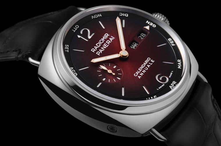 ▲沛纳海Radiomir系列2023年推出品牌史上首款年历功能手表,包括Goldtech™红金与Platinumtech™材质两种款式,后者搭配酒红色面盘,属于更稀有的体验版。